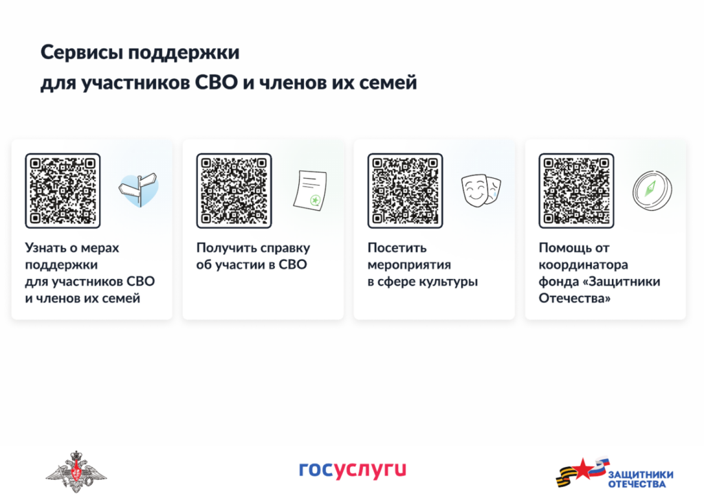 Минцифры России совместно с Минобороны РФ разработали унифицированный макет информационной страницы, который включает в себя QR-коды, ведущие на официальные ресурсы с актуальными сведениями о мерах поддержки для бойцов СВО и их семей.